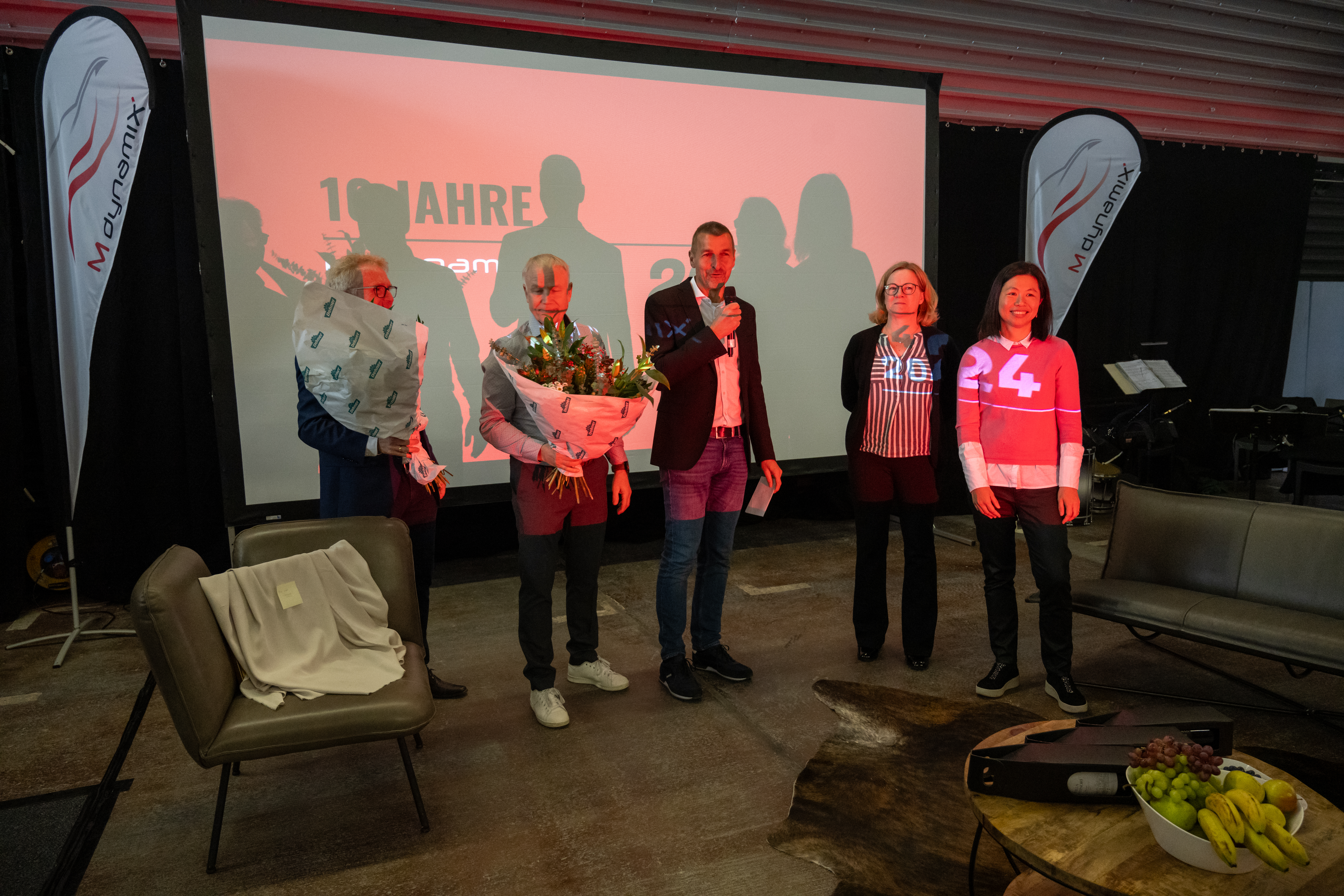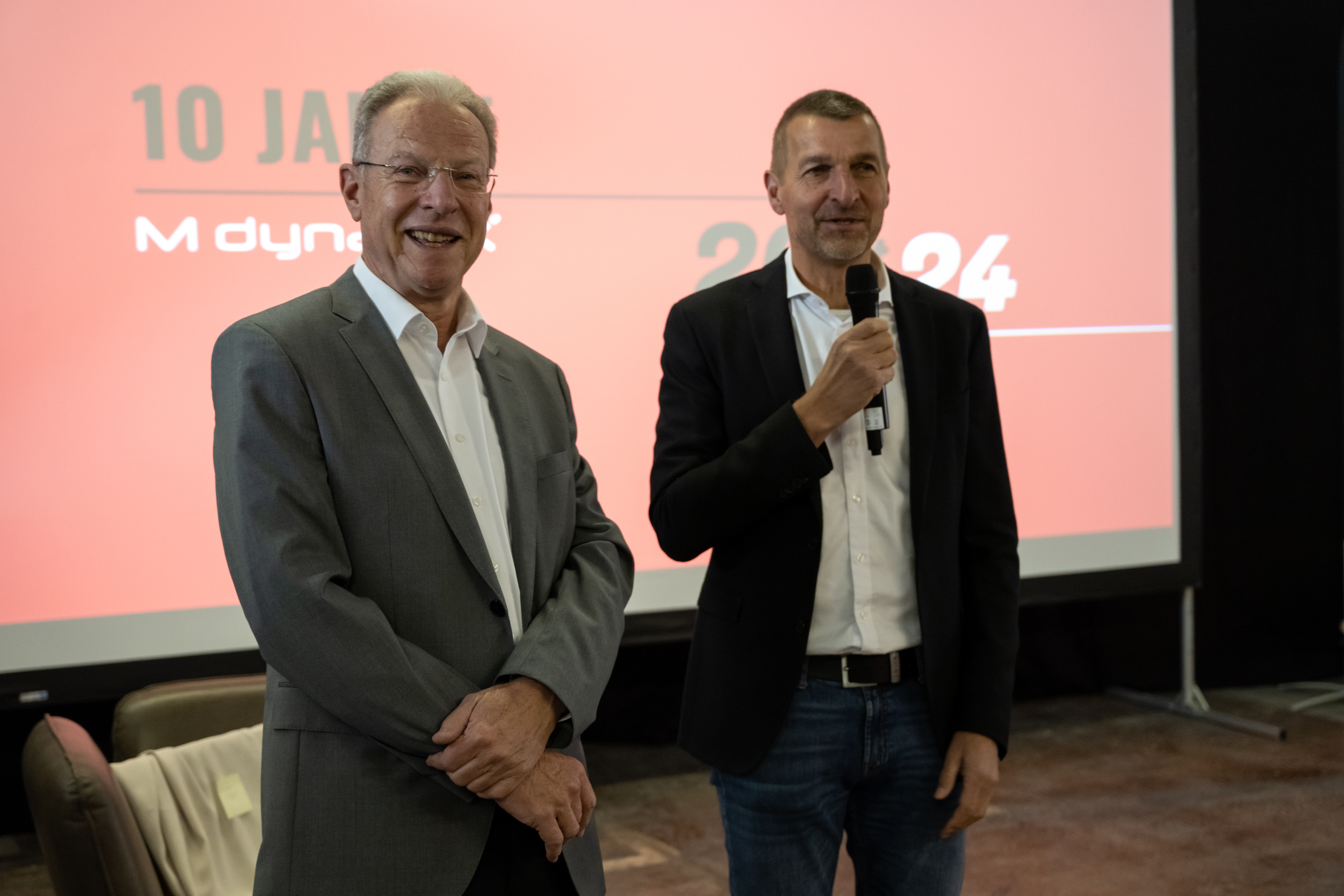 Honouring our pioneers: We have also honoured our long-standing employees. Two remarkable personalities have been with us from the very beginning and have shaped MdynamiX over the last decade. Congratulations to Cornelia Joos and Dr Jinhuai Meiswinkel-Lin! In addition to the employees, the board members from the very beginning were also honoured. Thanks to Prof Dr Peter Wolfsteiner, Prof Dr Clemens Klippel and Prof Dr Andreas Gubner. The MdynamiX founders – Prof Bernhard Schick, Prof Dr Peter Pfeffer, Prof Dr Markus Krug and Prof Dr Stefan Sentpali – were also surprised.