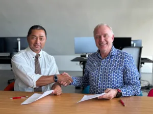 Photo: Masanori Kobayashi, President and CEO of NewtonDynamiX Inc., and Prof. Bernhard Schick, CEO of MdynamiX AG, at the MdynamiX site in Benningen during the signing of the cooperation agreement (f.l.t.r.).